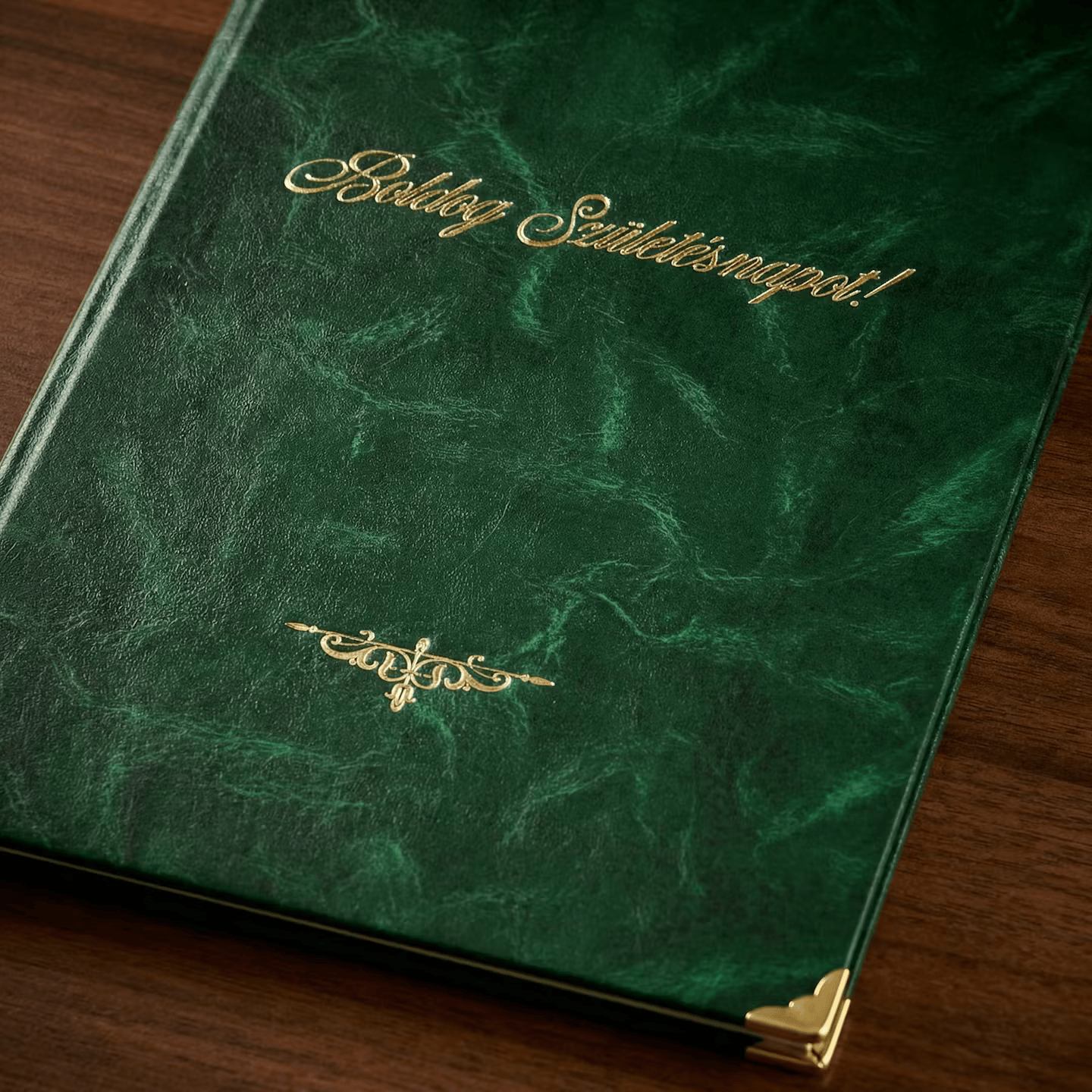 Az ár tartalmazza a választható színű elegáns köttetést, Boldog születésnapot felirattal, a gerincen pedig az évszámmal
